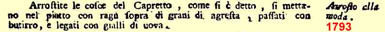 die ganz traditionell mit Eigelb gebunden sind.Der Weg konnte aber auch umgekehrt sein. Ein Entree "alla salsa di Butirro", das in der Ausgabe von 1773 noch mit der typischen Bindung aus Eigelb und agresta serviert wurde, erhält in der Ausgabe von 1793 als Schlusspointe stattdessen die in Butter geschwenkten heimischen Krebse.